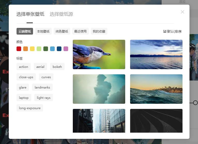 在单张壁纸下,可以选择云端壁纸、本地壁纸、纯色壁纸,还可以查看最近使用的壁纸、已收藏壁纸。