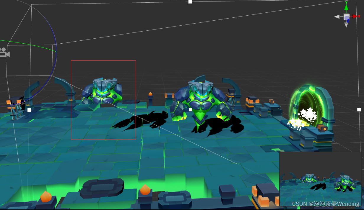 如图,结合相机位置和右下角相机拍摄出的画面来看,由于长方体柱子的深度值比其他模型的深度值要小,(由于深度测试函数是LESS,深度值小的通过测试)使得长方体背后的模型的片段被剔除了,因此长方体遮挡住了其他物体(包括地面)。接下来我们对长方体的深度测试做一些配置修改,再看看显示效果: