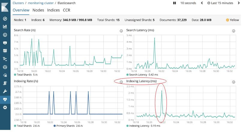 当集群不堪重负时,度量标准关联显示CPU利用率高和索引化延迟大(如下图)。