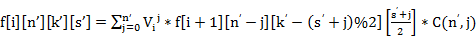 设f [i][n’][k’][s’] 表示 g [i][n’][k’][s’] 对应所有方案的权值之和,那么