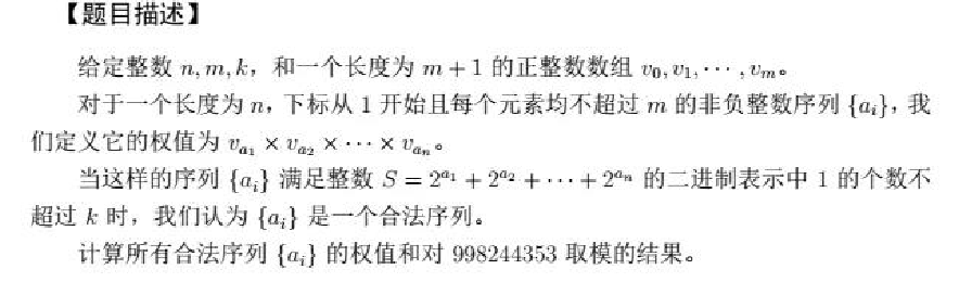 根据题目,直观的想法,首先计算出所有合法的序列{ai},对于每一个合法序列求出对应权值,最后求总。于是简单的求法,就是枚举所有的序列,判断是否合法,合法就求出权值。每个ai有m+1种选择,总共枚举量是(m+1)n, 判断合法是O(n)的复杂度,求权值也是O(n),总复杂度O(n*mn)。题目的数据范围,1 ≤ k ≤ n ≤ 30,0 ≤ m ≤ 100,1≤vi≤998244353。这么大的数据量,指数复杂度,显然是不可行的。所以需要仔细分析下题目的数学特性。