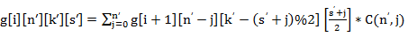 令g [i][n’][k’][s’] 表示,当S的第i ~ i+5位初始状态为s’的情况下,从i~m中取n’个数(可重复取),取数后S为1的位的个数不超过k’。此时,合法数列{ai}的方案总数。有