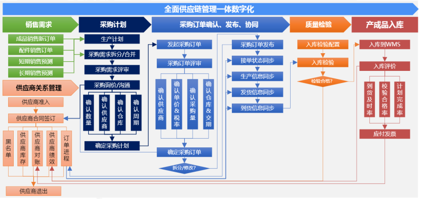 供应商能随时根据需求准备生产,有效缩短供应链运营时间。企业内部各职能部门也能建立对应的物料风险等级管控系统,基于订单-工单流转的可视化、数字化智慧供应链,基于供应商准入-供应链质量-供应商评级的全面数据集成体系能帮助企业高效决策。
