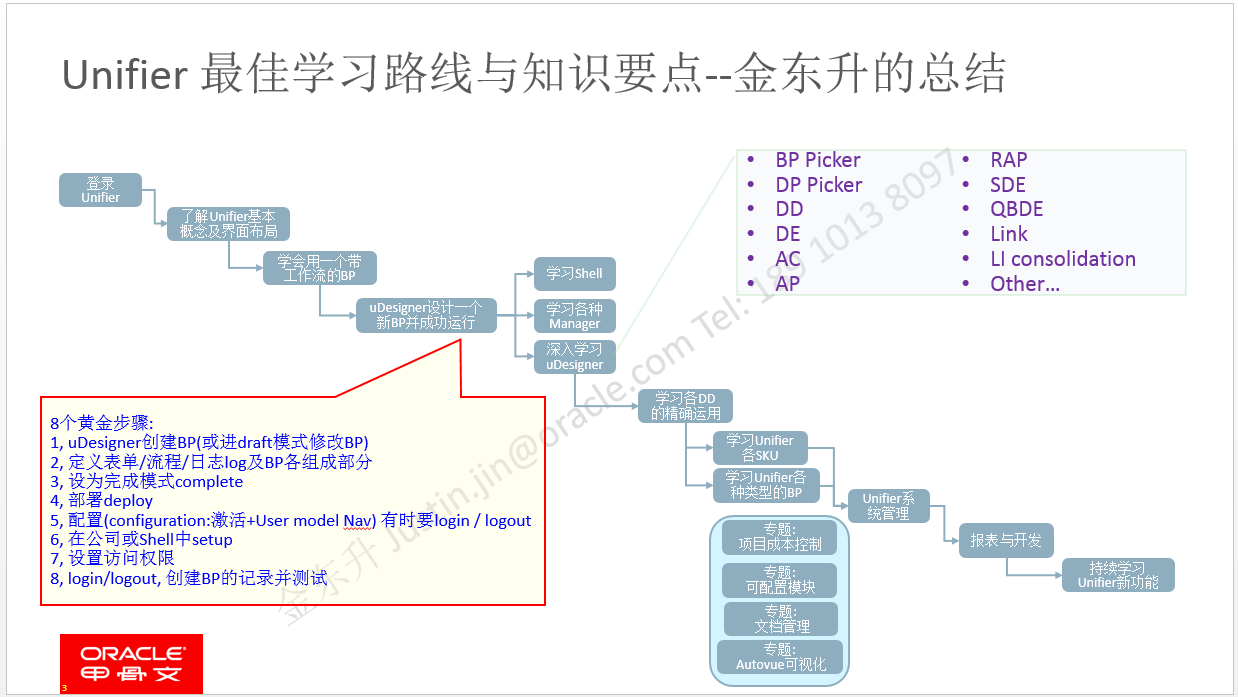 经过很多年的学习Unifier, 结合我在中国多年培训及课堂反馈, 总结出来了一个行之有效的学习路线图, 如下: