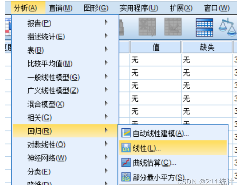 在SPSS里,中介效应的操作过程是建立线性回归模型。点击“分析”——“回归”——“线性”,打开线性回归的界面。