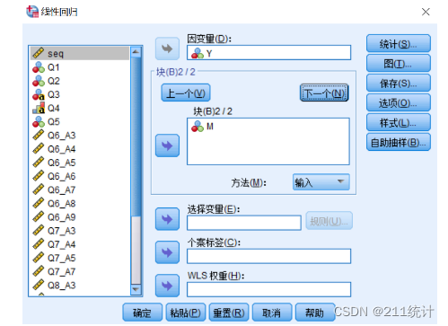 把自变量X放到第一个Block(块),点击“下一个”,中介变量M放到第二个Block(块)。
