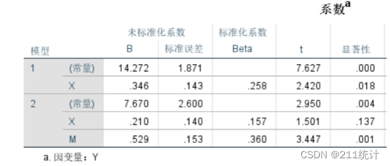 再看看最后一列的显著性,模型1自变量X的显著性为0.018,小于0.05,说明自变量X对因变量Y是有显著影响的。模型2中,自变量X的显著性为0.137,大于0.05,自变量X对于因变量Y的影响变得不显著了。中介变量M对因变量的影响是显著的。