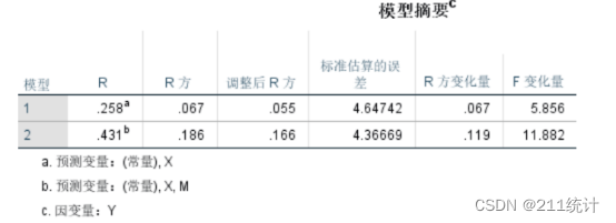 调整后的R方从0.055(。。好低)上升到0.166,好吧也没有多高,但是说明了中介变量M的加入,自变量X对因变量Y的影响增大了。