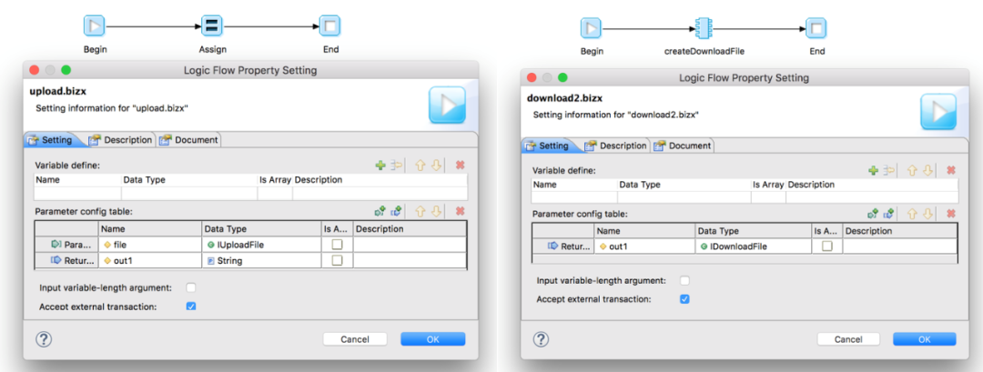 定义一个逻辑流,逻辑流的输出参数类型是“com.primeton.ext.access.http.IDownloadFile”,文件下载只支持一次下载一个文件,注意:该逻辑流执行完毕后,下载的文件就会被自动删除。
