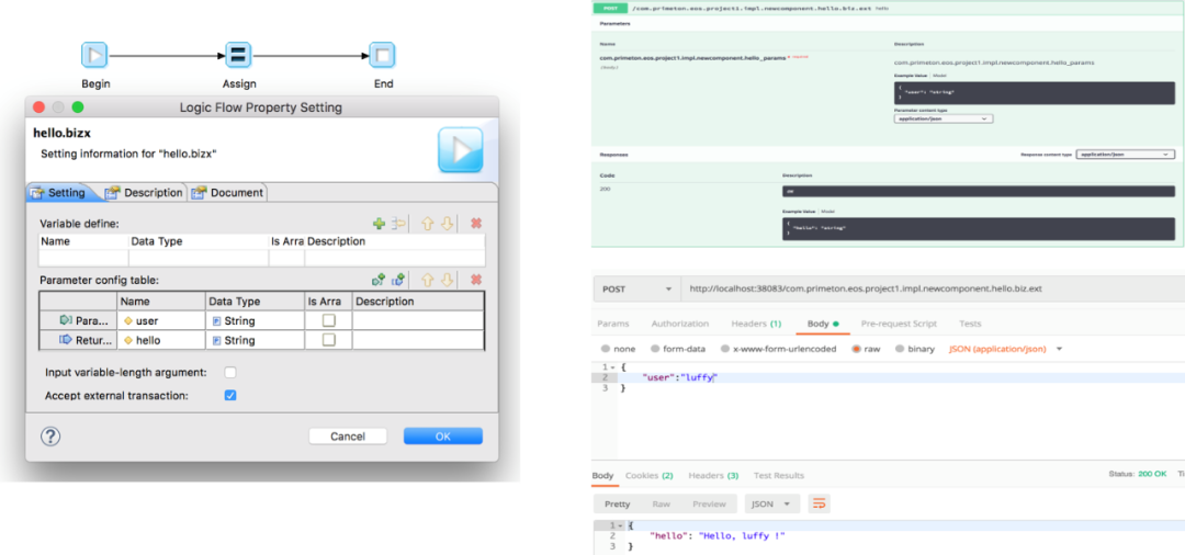 这是一个Hello World的示例,定义了一个输入/输出参数。通过Postman发送一个POST请求并加上Body参数:{"user": "luffy"},可以看到输出:{"hello":"Hello, luffy !"}