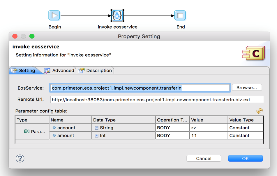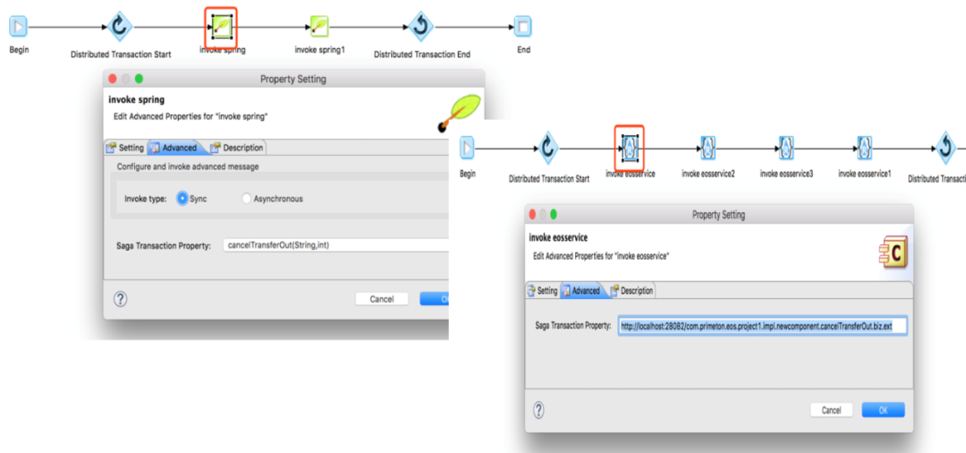 在【高级】tab页里有补偿的输入框,补偿的输入框的值是一个URL,该URL指向的是另一个EOS服务,补偿的EOS服务需要和原服务有一样的输入参数。