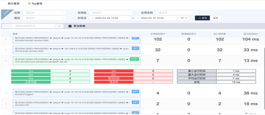 API调用统计可以按照应用、实例组、实例、API来统计汇总请求信息,包括:响应状态码,请求数,最小响应时间,最大响应时间,平均响应时间以及响应时间总和。支持按应用、实例组、实例、API、时间段等条件进行查询以及按请求数和响应时间排序。
