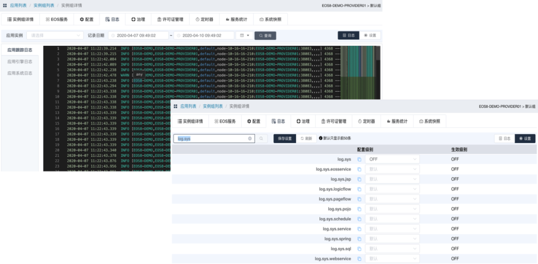可以查看应用运行时的日志,和老EOS一样,仍然分为3种日志并支持在线调整日志级别: