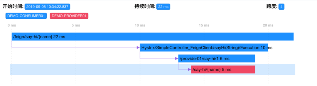 通过请求链路可以查看一个请求是成功还是错误,请求处理时间是多少,以及它的调用链路:经过了多少应用,在每个应用内的耗时是多少。