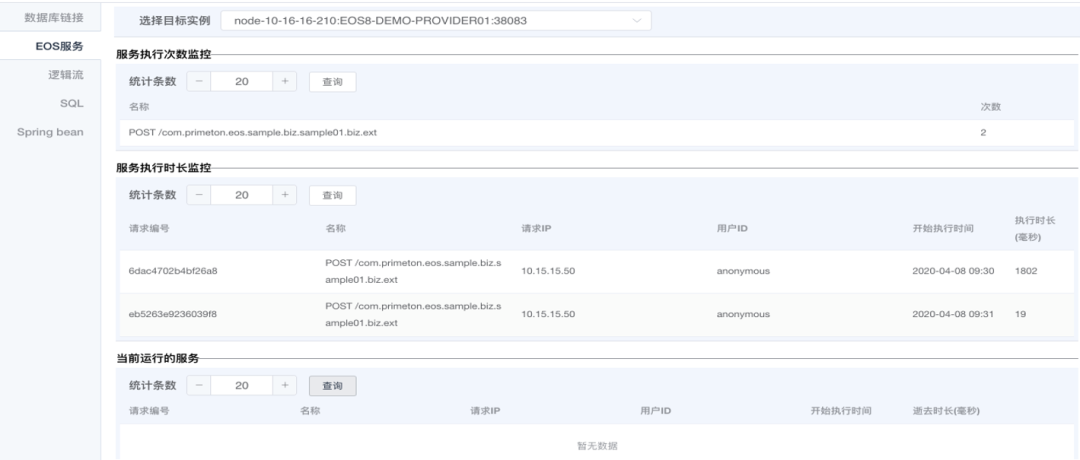 在Govenor上还可以看到EOS服务的统计信息,包括:执行次数,执行时长以及正在运行的EOS服务。