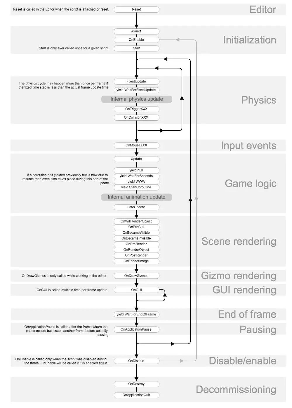 19.Unity3D 协程是在主线程中执行的,在Update()方法之后,LateUpdate()方法之前调用。Unity在每一帧都会去处理对象上的协程,遇到yield return 语句会挂起,直到条件满足才会被唤醒继续执行后面的代码。使用StartCoroutine和StopCoroutine()方法来开启,结束协程,也可以在启动协程时定义一个Coroutine变量去保存协程,然后调用stop方法去停止协程。
