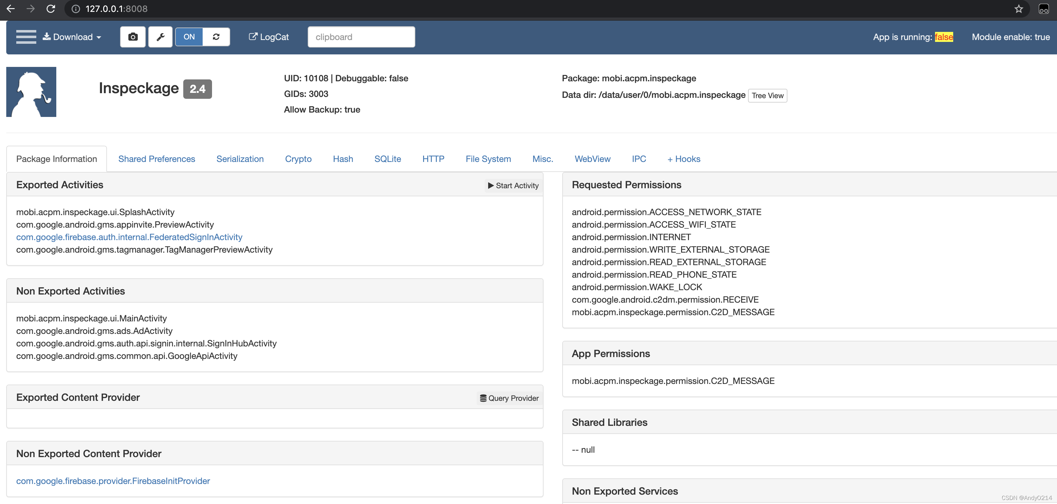 Inspeckage是一个用来动态分析安卓app的xposed模块。Inspeckage对动态分析很多常用的功能进行了汇总并且内建一个webserver。整个分析操作可以在友好的界面环境中进行。
