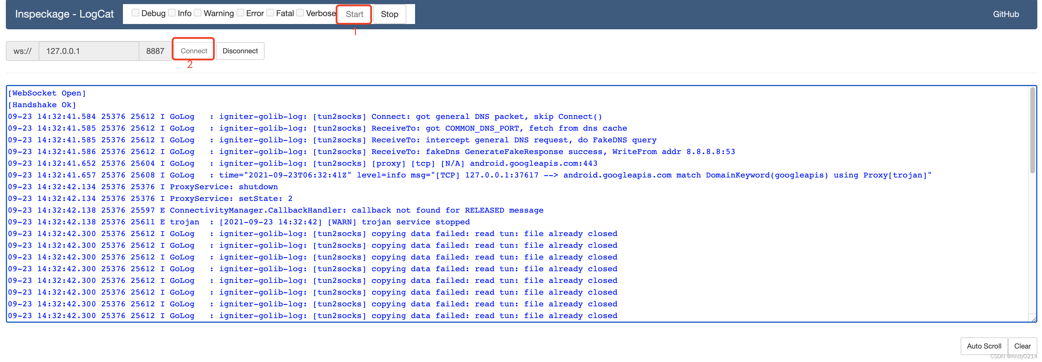 点击Start,再点connect就可以在网页中实时查看app的logcat输出