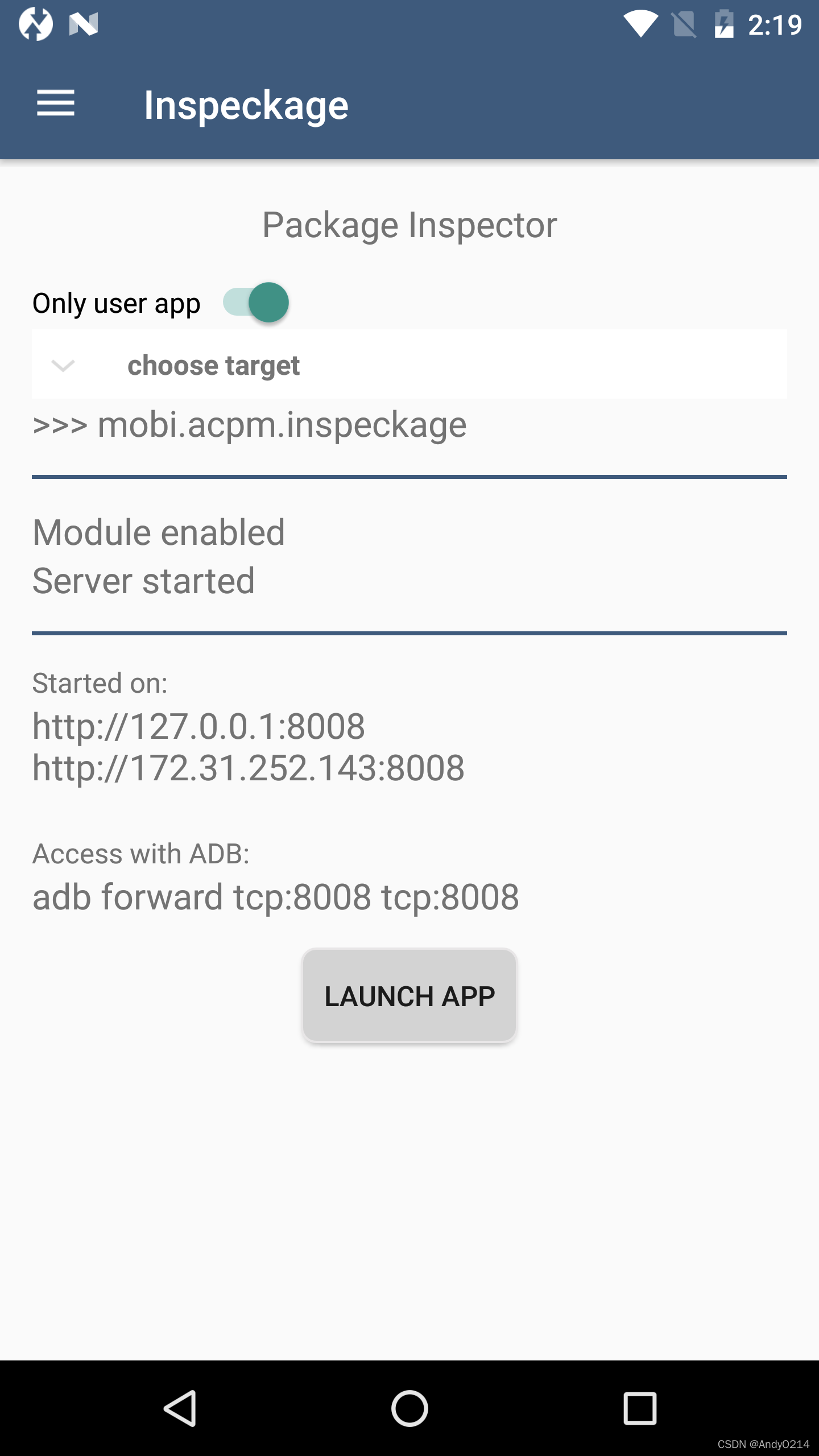 Inspeckage运行后,界面如下。Module disable表示没有安装xposed模块,在choose target下拉列表中选择要分析的app
