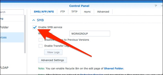 On the “SMB/AFP/NFS” tab, enable the “Enable SMB Service” option. If you have macOS El Capitan or older, you’ll want to use AFP instead by scrolling down a bit and ticking the “Enable AFP Service” check box.