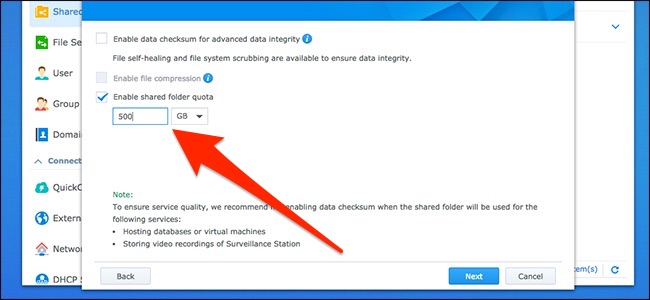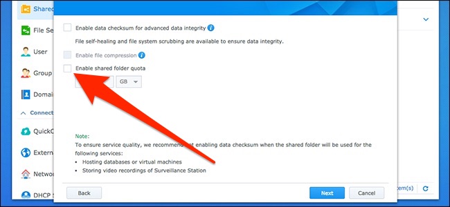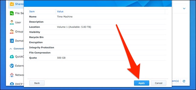 Turn on the “Enable Shared Folder Quota” option. This places a maximum capacity on the shared folder so that Time Machine doesn’t continue to create more and more backups until it fills up the entire NAS.