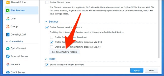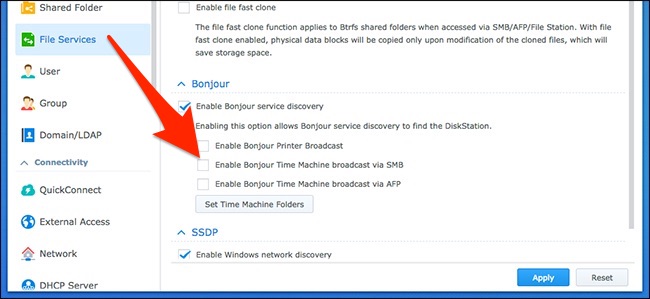 Next, witch over to the “Advanced” tab, and then tick the “Enable Bonjour Time Machine broadcast via SMB” option (or AFP if you’re on an older version of macOS).