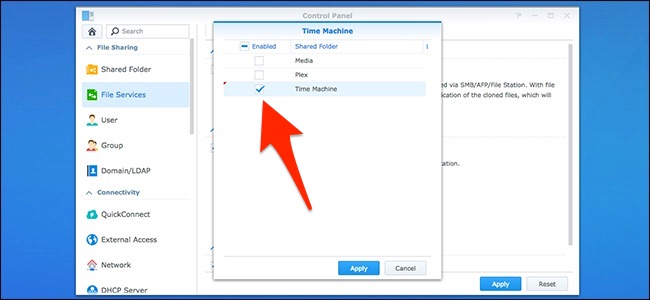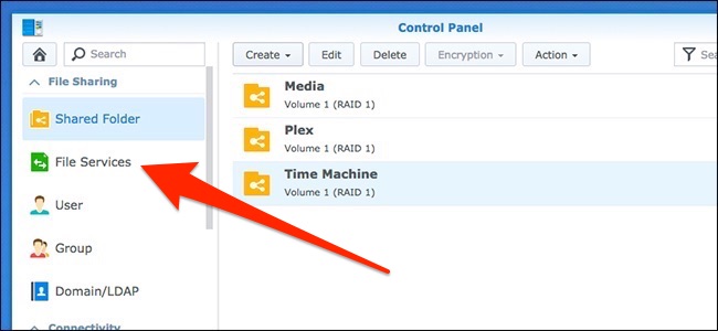 Now that you’ve created the shared folder, you need to enable a couple of features so that Time Machine can successfully back up to it. To get started with this, click “File Services” in the left-hand sidebar of the NAS control panel.