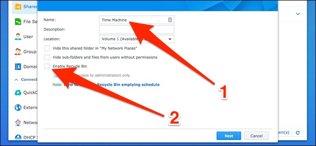Give the shared folder a name (like “Time Machine”) and then disable the Recycle Bin (you won’t need this for Time Machine backups). Hit “Next” to continue.