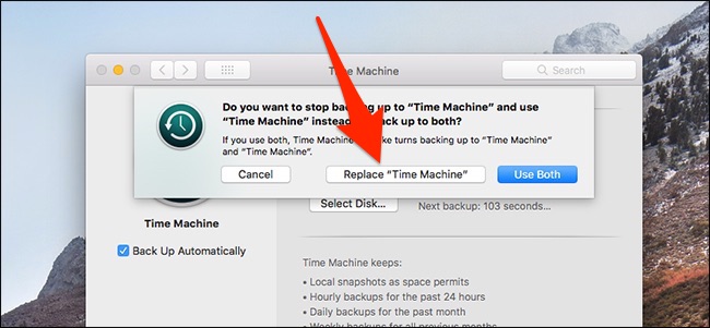 如果您以前有一个与Time Machine链接的存储驱动器,则会弹出一个对话框,询问您是否要使用两个磁盘或将旧磁盘替换为新磁盘。 选择“替换”选项。