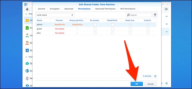 Next, you’ll set user permissions for the shared folder. The defaults are pretty good, so you’re safe just going ahead and hitting the “OK” button. You can create a new user specifically for the Time Machine backup with a different password and everything, but it’s not required.