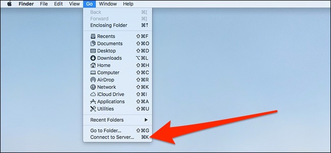 On your Mac desktop, open the “Go” menu, and then select the “Connect to Server” command.