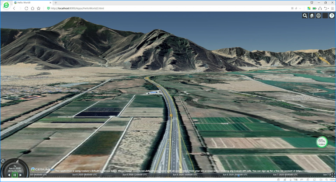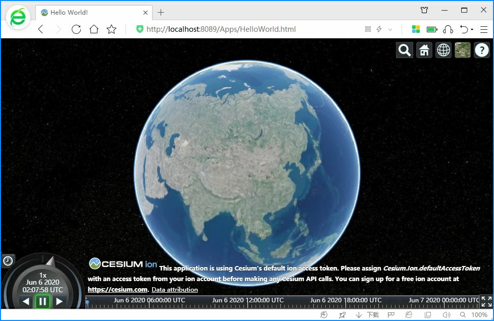 在Cesium主页中点击“Hello World”链接,可以显示在线地球,如下图所示。