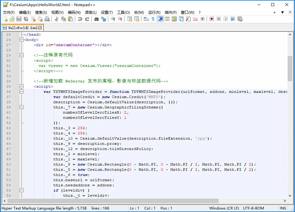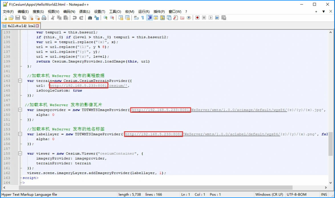 打开“HelloWorld2.html”文件,然后注释原有的地球加载代码,新增加载 WeServer 发布的高程、影像与标签数据代码,如下图所示。