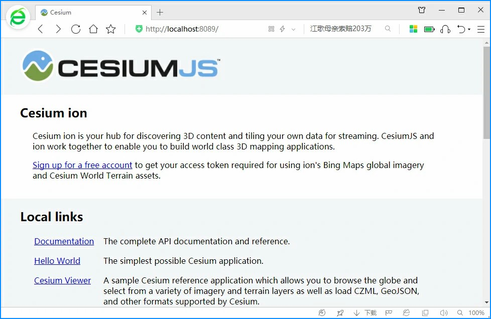至此,一个部署到本地的Cesium系统就完成了,但卫星影像数据和高程数据依然来自于互联网,接下来我们会讲解如何将本地离线的谷歌卫星影像与高程DEM数据加载到Cesium中。