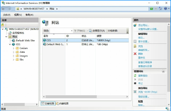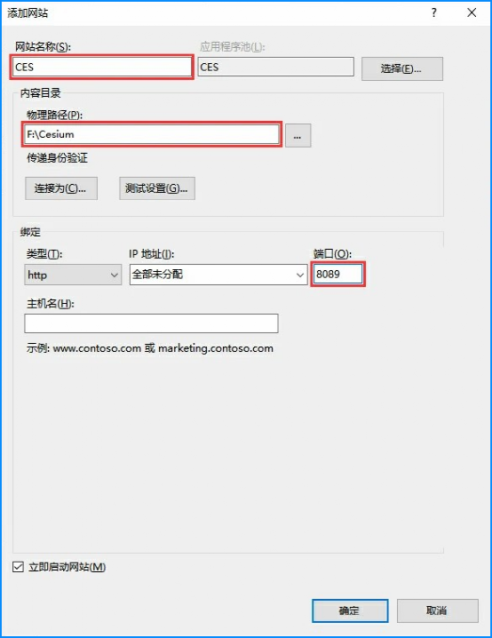 网站名称可以任意取,这里我们取名为“CES”,物理路径为Cesium源码所在路径,由于我们在安装配置WeServer时占用了80端口,这里我们将端口号设置为“8089”,如下图所示。