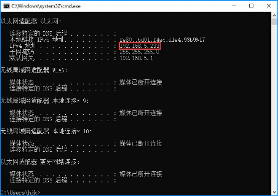本机IP地址:由于会用到本机IP作为设置参数,可以通过在DOS窗口中运行“IPConfig”命令或其它方式获取本机IP地址以备用,如下图所示。