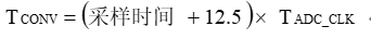 转换速度通常表示完成一次AD转换花费的时间。在STM32L4系列芯片中,完成一次完整的AD转换时间是配置的采样时间与逐次逼近时间(具体取决于采样精度)的总和。例如,如果ADC的时钟频率为FADC_CLK,时钟周期为TADC_CLK。采样精度为12位时,逐次逼近时间固定为12.5个ADC时钟周期。其中采样时间可以由SMPx[2:0]寄存器控制,每个通道可以单独配置。计算转换时间TCONV为: