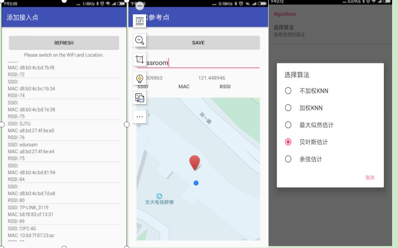 - 使用WIFI 定位功能之前,用户可以选择使用的算法。系统实现了几种基本算法:KNN(Euclidean \ Cosine) \ Bayes。用户可以使用不同的算法进行试验。