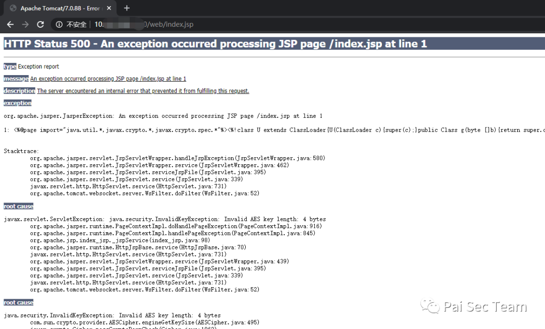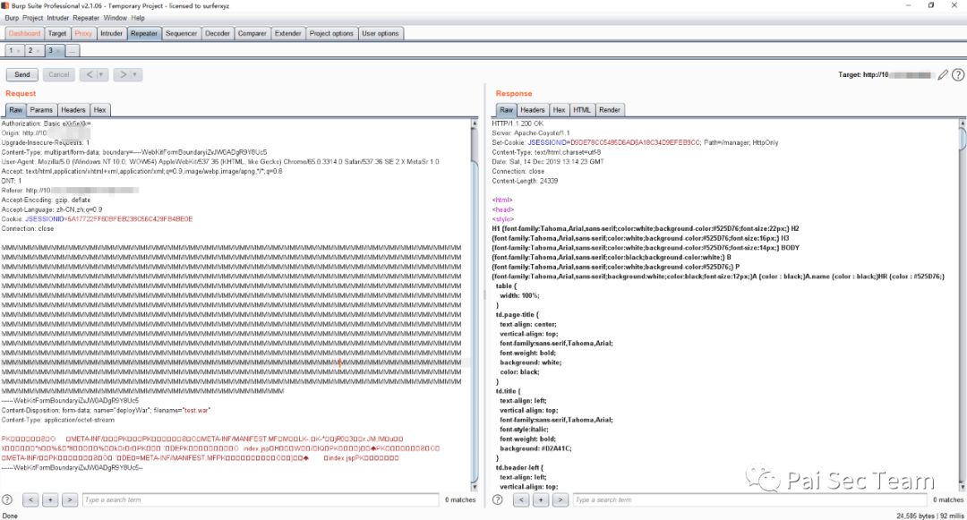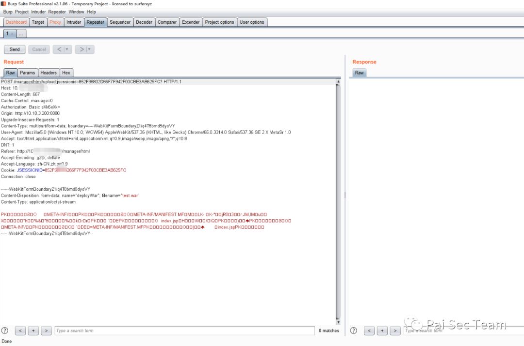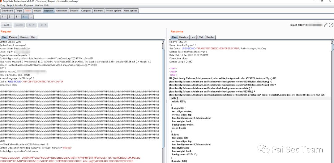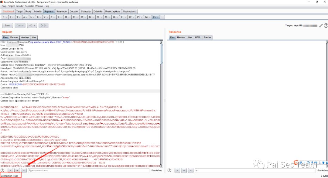 上传war后门文件时,浏览器显示该网页无法正常运作,进而对上传数据包进行分析发现数据包被防护系统reset。因此进行初步判断war文件被拦截,所以尝试对war文件进行测试。