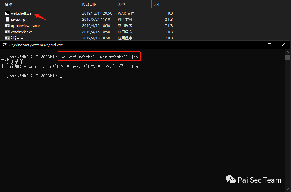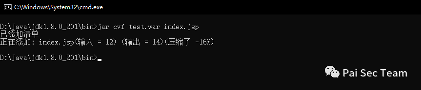 3、执行 "jar cvf webshell.war webshell.jsp"命令,生成webshell.war后门文件。