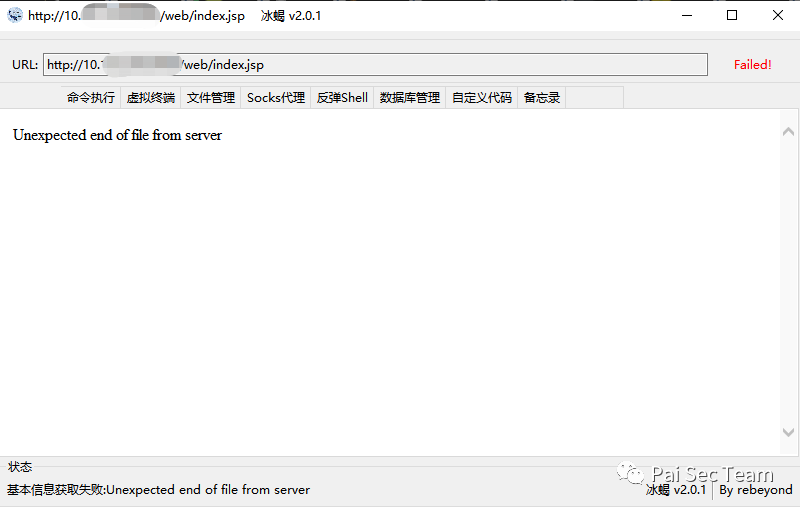 制作冰蝎war后门文件并上传服务器,使用冰蝎客户端连接远程webshell时发现被WAF拦截。结合上文可得出如下结论:应用防火墙对上传文件格式进行拦截,同时对网络流量进行分析和阻断,因此除了绕过对文件格式的限制,还需要对通信流量进行加密传输。