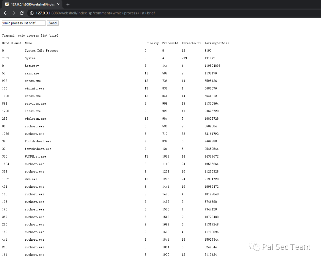 在war文件上传处上传webshell后门文件,获得服务器权限,访问webshell后门并执行系统命令(wmic process list brief)。
