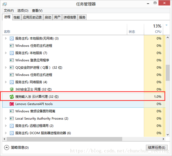4、找到搜狗输入法,云计算代理,选择结束任务: