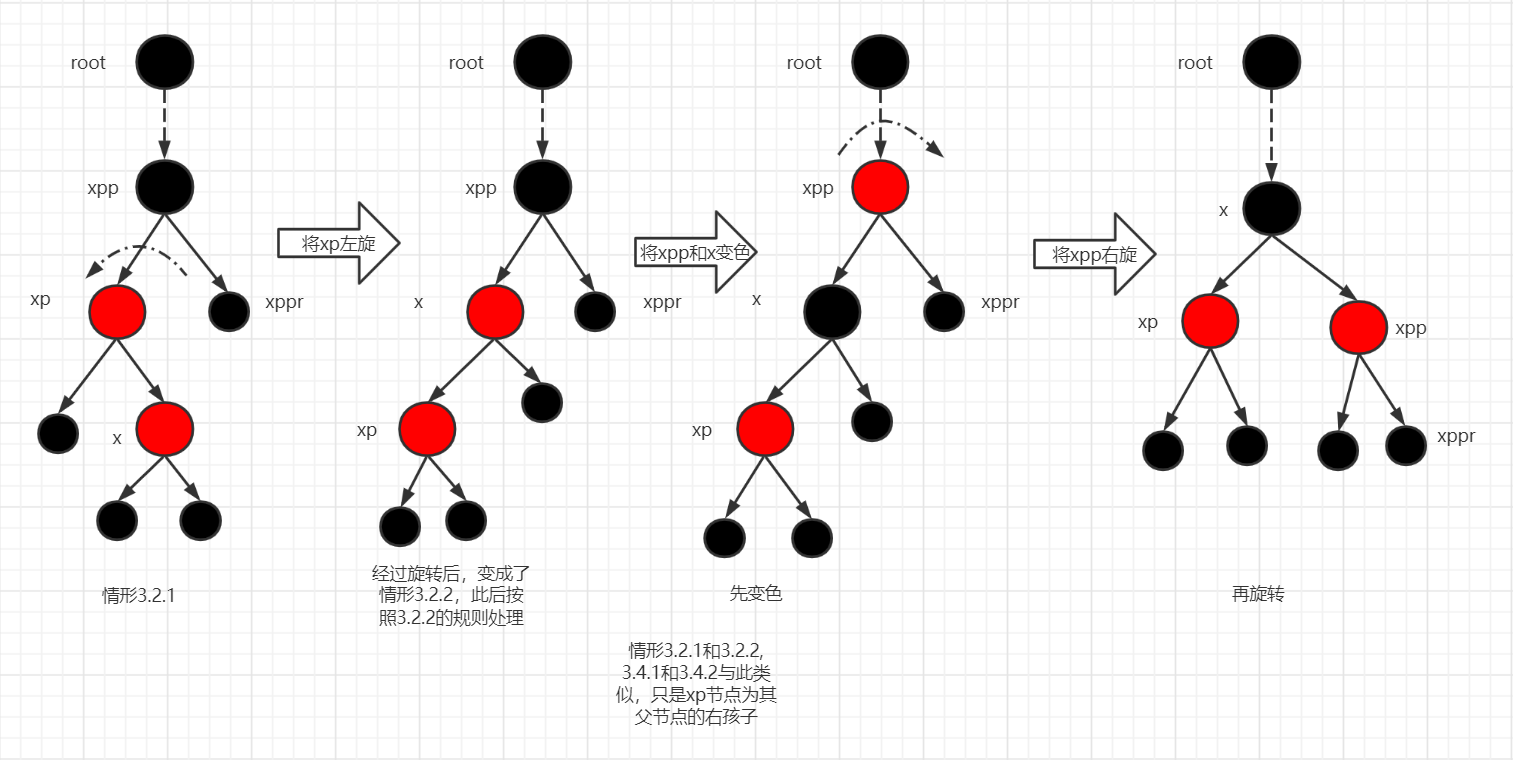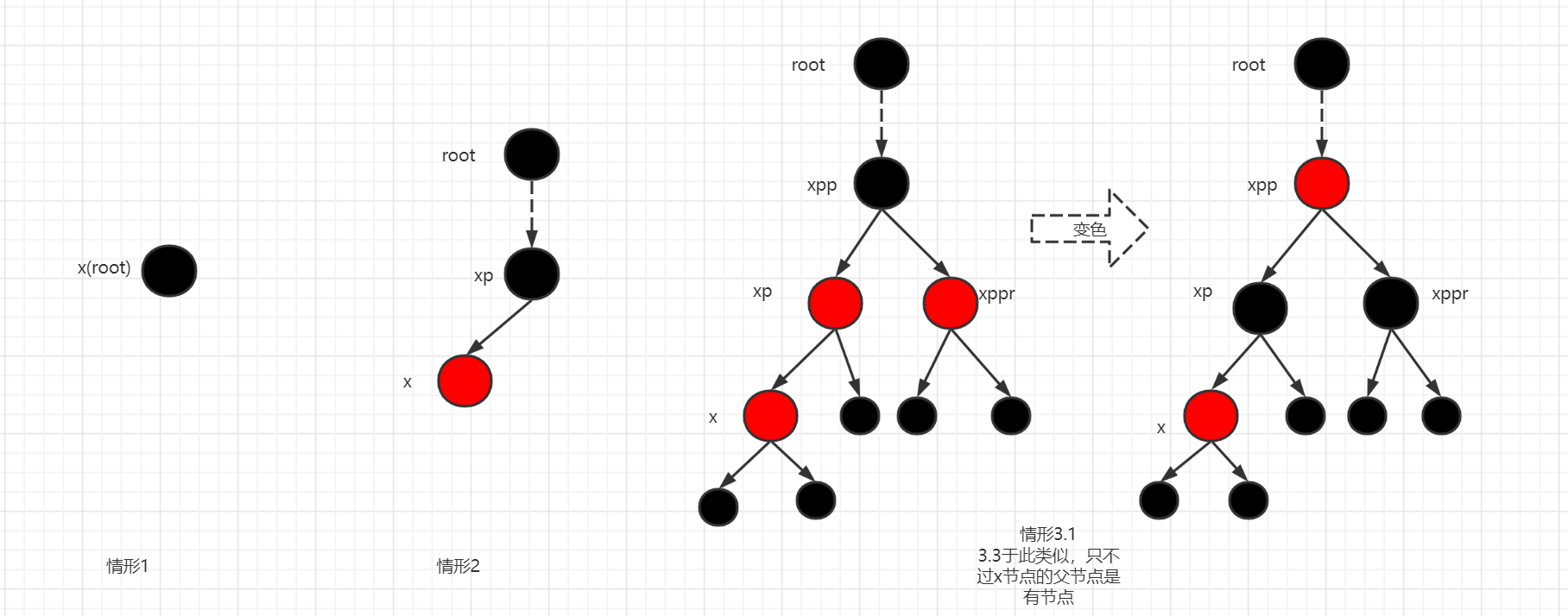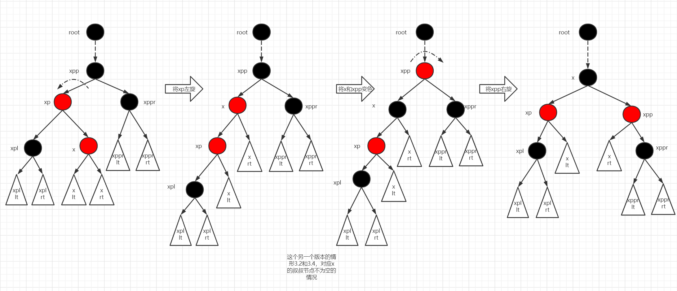 x:当前节点,xp:当前节点的父节点,xpp:当前节点的祖父节点,xppr:当前节点的右叔叔节点(对3.3和3.4来说就是xppl:当前节点的左叔叔节点)
