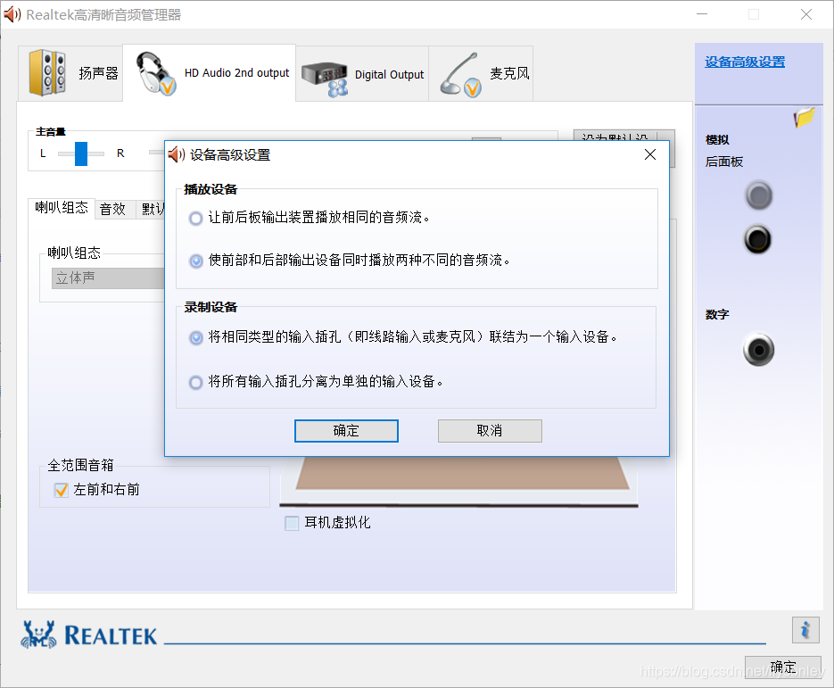 步骤二、打开Realtek高清晰音频管理器->设备高级设置->同时播放两种不同音频流