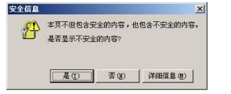 请注意:有些部署了 SSL 证书的网站会有不安全因素警告 ( 如下图所示 ) ,表明此页面中含有指向其他没有部署 SSL 证书的页面,为了安全起见,建议您选择“否”,浏览器就不显示不安全的内容,这些内容一般都是 Flash 动画或 Java Script ,如果选择“是”,则浏览器不会显示安全锁标志。