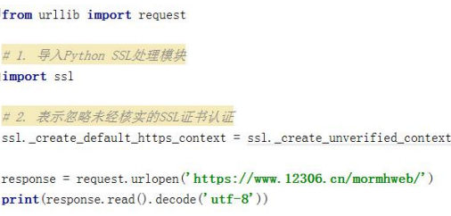 现在随处可见 https 开头的网站,urllib2 可以为 HTTPS 请求验证 SSL 证书,就像 web浏 览 器 一 样 , 如 果 网 站 的 SSL 证 书 是 经 过 CA 认 证 的 , 则 能 够 正 常 访 问 , 如 :https://www.baidu.com/等... 如果 SSL 证书验证不通过,或者操作系统不信任服务器的安全证书,比如浏览器在访问 12306 网站如:https://www.12306.cn/mormhweb/的时候,会警告用户证书不受信任。(据说 12306 网站证书是自己做的,没有通过 CA 认证)