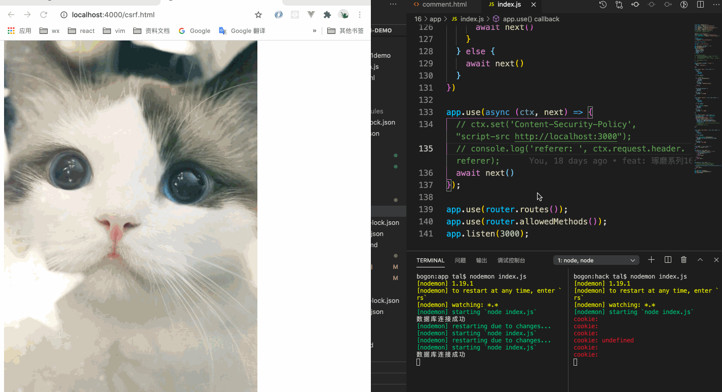 };const app = new Koa();app.use(static(__dirname + '/'));// 主要的逻辑就是这个中间件,这里打印了一下请求里携带的cookie