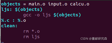 程序分析:设置字符串main.o input.o calcu.o并使其赋值给objects