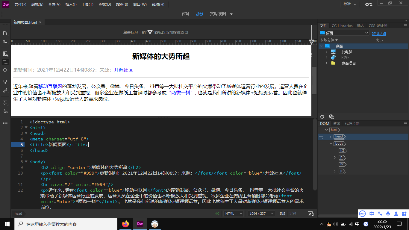 段落标签实现“更新时间”独占一行,再用标签中的属性(color)让字体改变颜色;